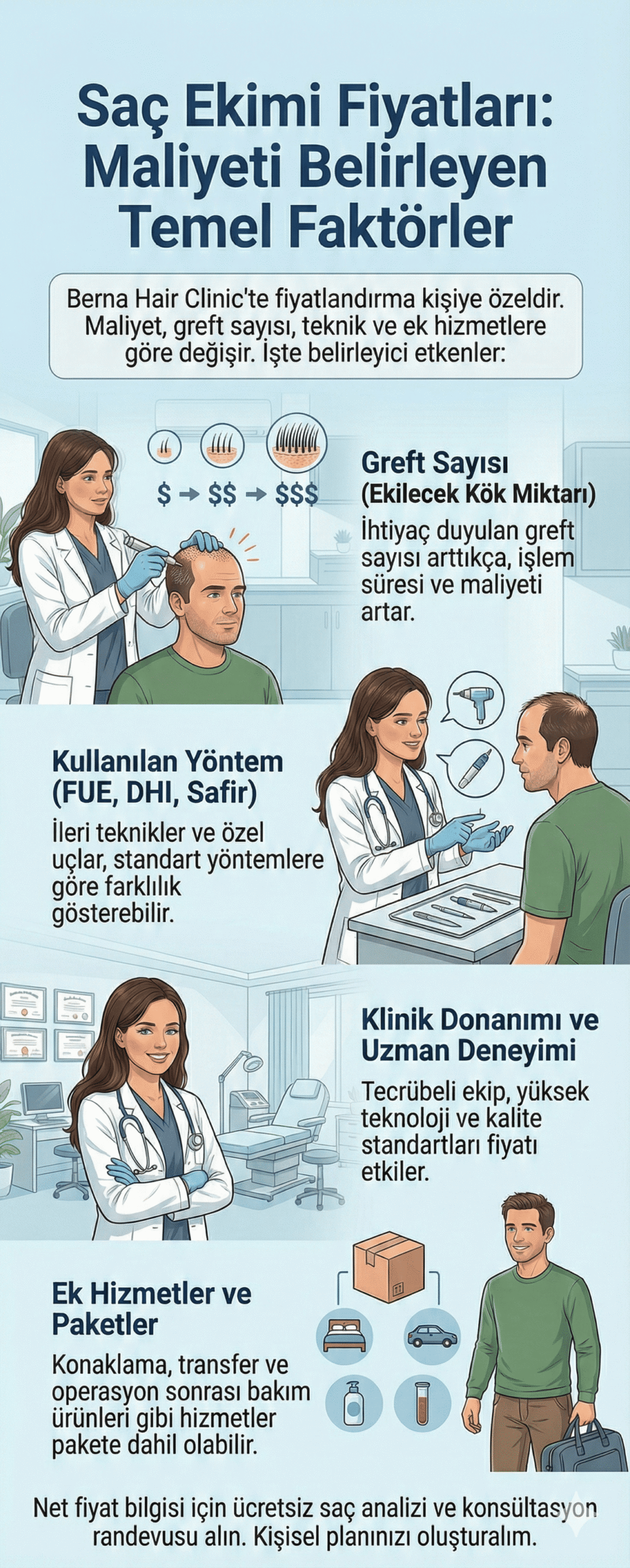 ‘Saç ekimi fiyatları’ en çok merak edilen konulardan biridir. İstanbul’da saç ekimi fiyatları, kliniğin kalitesi, kullanılan teknik, ekilecek greft sayısı ve sunulan ek hizmetlere göre değişkenlik gösterebilir. Berna Hair Clinic olarak, fiyatlandırma politikamızda şeffaflığı ve erişilebilirliği ön planda tutarız. Her hastamız için özel bir değerlendirme yaparak, ihtiyaçlarına ve bütçelerine en uygun çözümü sunmayı hedefleriz. Fiyatlandırma hakkında detaylı bilgi almak ve size özel bir teklif oluşturmak için ücretsiz danışmanlık hizmetimizden faydalanabilirsiniz. Unutmayın, saç ekimi bir yatırım kararıdır ve sadece fiyat odaklı değil, aynı zamanda kliniğin kalitesi, deneyimi ve sunulan hizmetlerin kapsamı da göz önünde bulundurulmalıdır.